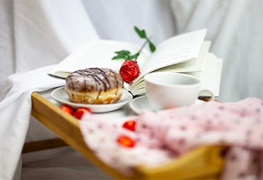 Si decidiste que tu desayuno sorpresa sea en la cama, también debes pensar muy bien en el menú, ya que el espacio es reducido procura presentarlo en porciones pequeñas para que tengan un aspecto atractivo y apetitoso y sean más fácil de comer en la cama, como unos mini chiques, un poco de fruta como una banana con dulce de leche y una bebida caliente como un Mokaccino.