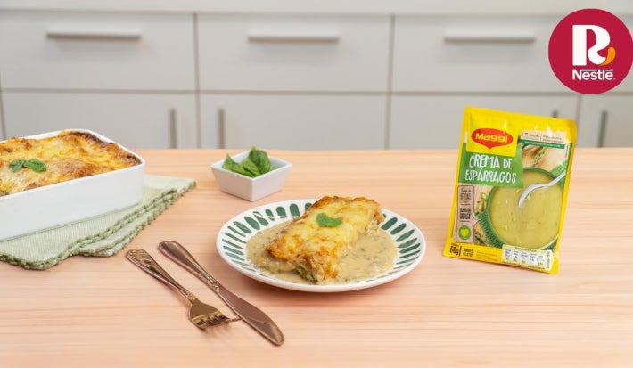 Receta de pasta rellena con una rica y cremosa mezcla de espárragos frescos y Crema de Espárragos MAGGI®. Se prepara la mezcla con un sofrito, en el que se va a disolver la Crema de espárragos MAGGI® con la Leche Evaporada IDEAL®.