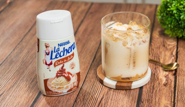 - 1.En bowl suficientemente alto que permita realizar un postre en capas, agregar como primera capa una base de Dulce de Leche LA LECHERA®.