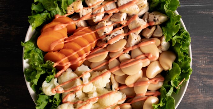 Prepara una rica ensalada de pollo con coliflor, habichuelas y zanahoria, ideal para una cena ligera.