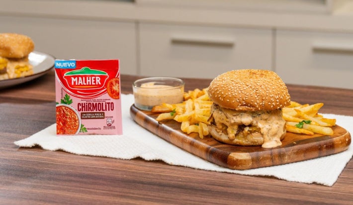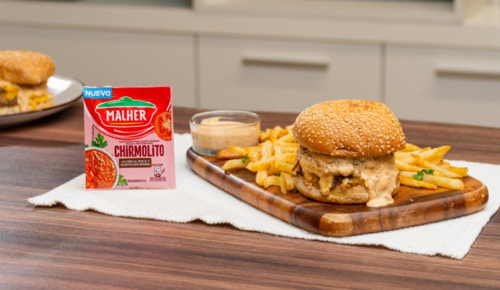 Esta Hamburguesa con Aderezo de Chirmolito combina jugosidad, sabor y un toque especial. La carne molida se sazona y se cocina estilo “smash”, logrando un dorado perfecto que potencia su sabor. La cebolla caramelizada añade dulzura y profundidad, mientras que el aderezo cremoso a base de Chirmolito MALHER® y mayonesa aporta frescura y un toque vibrante. Servida en un pan suave y acompañada de papas fritas, es una receta ideal para disfrutar en cualquier momento.