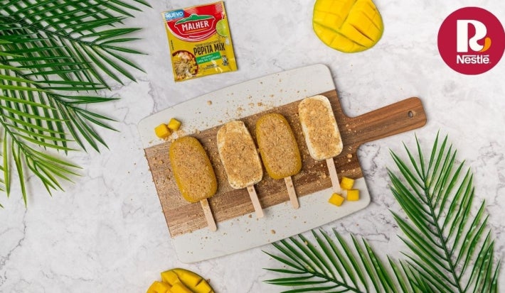 - 6.En el molde de paleta, añade una cucharada del puré de mango.