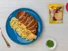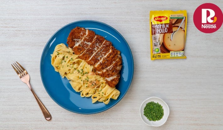 Pasta con pollo a la milanesa