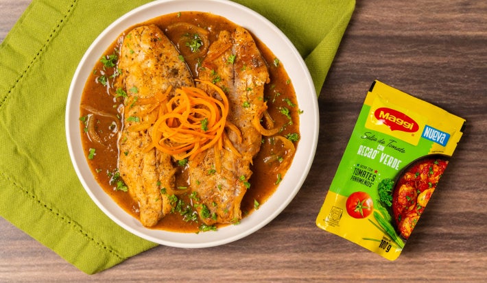 El Pescado Sudado a la Panameña con Salsa Maggi® con Recao’ Verde es una versión práctica y llena de sabor del clásico panameño. El pescado se cocina a fuego lento en una salsa jugosa de tomate, cebolla y pimentón, realzada con el toque intenso y aromático de la Salsa Maggi con Recao’ Verde. El resultado es un plato suave, bien sazonado y muy casero, ideal para acompañar con arroz blanco, patacones o yuca sancochada