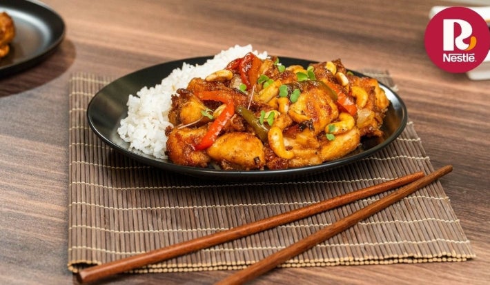 - 12.Cuando la salsa tenga consistencia, añade el pollo salteado y deja que todo se mezcle bien, aproximadamente durante 5 minutos. Finaliza con la cebollina y el cashew.