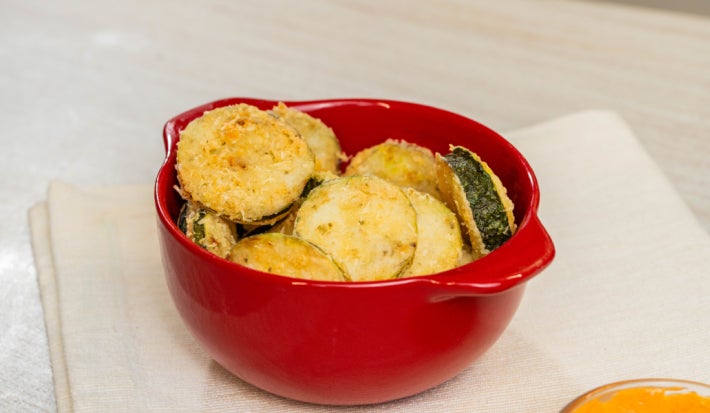 - 3.Empanizar el zucchini con la mezcla de harina y queso parmesano.